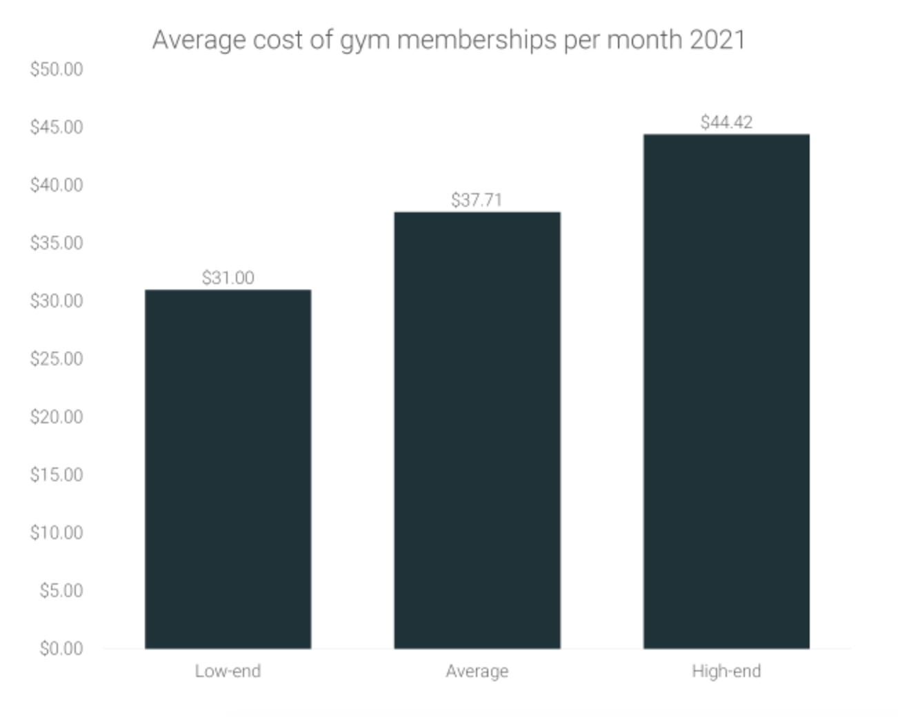 More recently, a report from Run Repeat analyzed the prices of 16 popular U.S. gym chains, including the likes of Gold’s Gym, 24 Hour Fitness, and Anytime Fitness. The report shows that the average gym membership price in 2021 across these examples is $37.71.