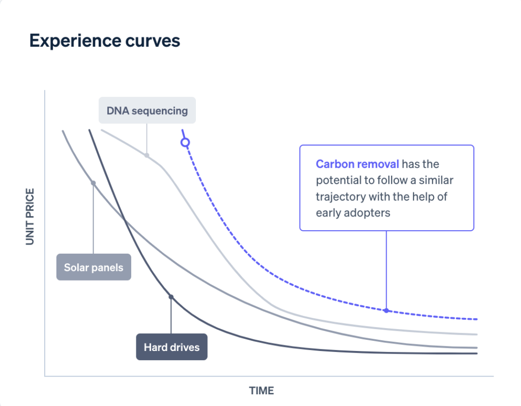 Early adopters of new carbon removal technologies can help these initiatives to lower costs and increase volume. Historically, experience curves have repeatedly shown that size and deployment lead to improvement, a pattern seen in DNA sequencing, hard drive capacity, and solar panels: