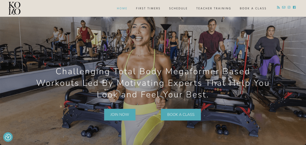 Komo Studio’s website is designed with lead generation in mind – providing visitors with clear CTAs for joining their studio or booking a singular class. The site also does a great job of putting Joy and her classes front and center, showing you exactly what’s in store for you when you sign up.