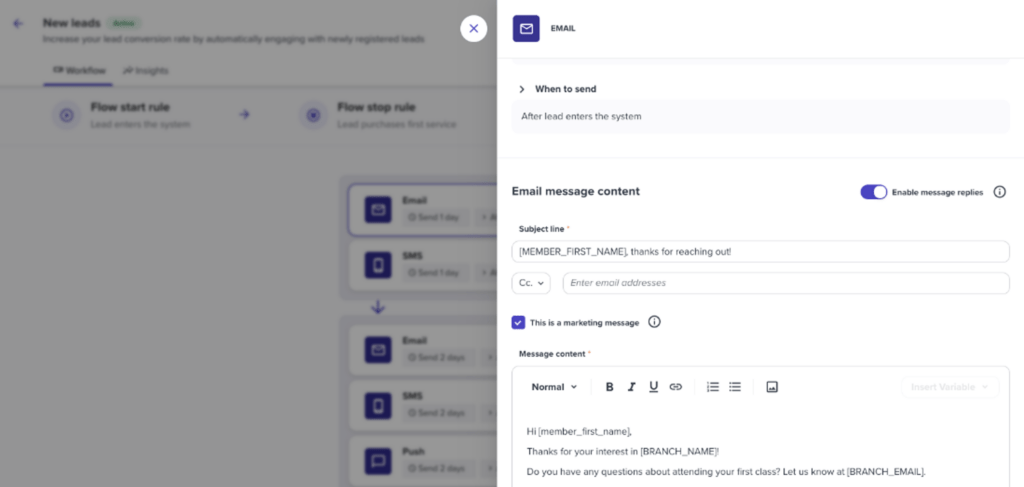 If you want to disable the ability for your members to reply to a specific email, you can do so when editing its content in the “Enable message replies” toggle, as shown in the image below.