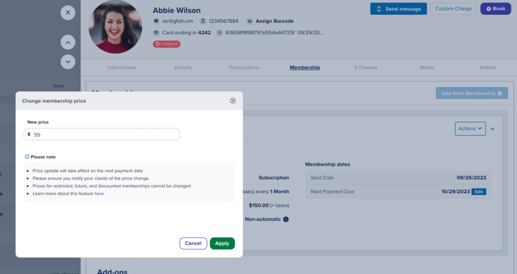- Easily adjust the price of an Unlimited or Group subscription directly in the client profile on your Dashboard