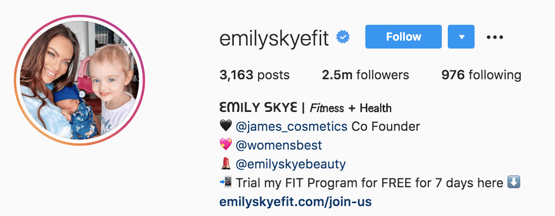 Emily Skye is another big name in the fitness influencer world. The fitness guru and personal trainer is an excellent example of how niching down can benefit your brand. Emily’s content is aimed at women wanting to get back in shape after having a baby. She wants to inspire other women who want to exercise throughout pregnancy and encourages others to set realistic targets.