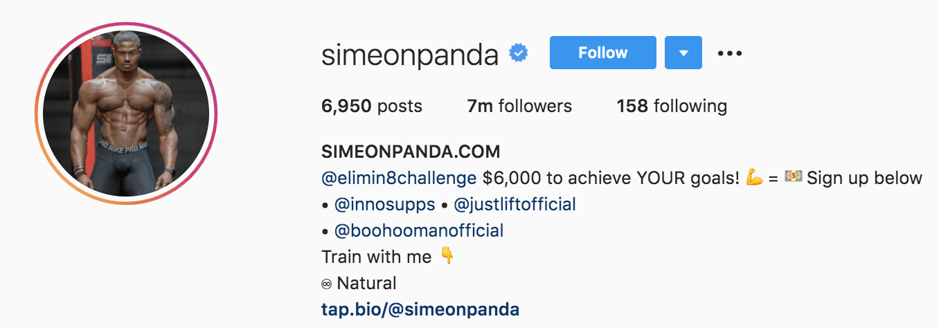 Simeon is the creator of the Elimina8 Challenge, an eight-week training platform to help followers boost their health and fitness. The fitness influencer has made a name for himself within the fitness industry. With online workout programs, accessories, and a sportswear line, Simeon regularly promotes his own products on his Instagram account as well.
