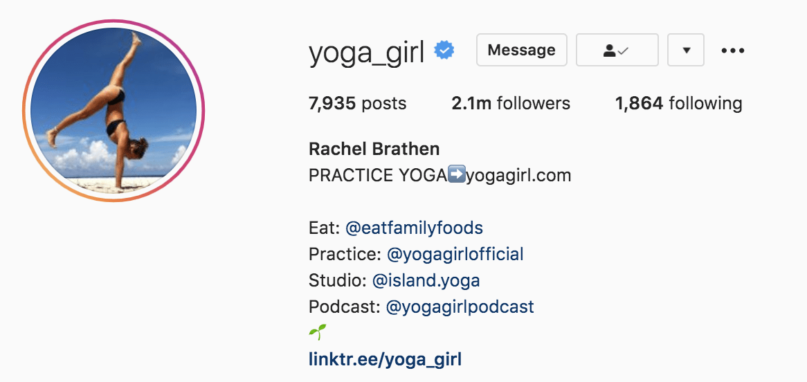 With just over two million followers, she uses her platform to talk about the benefits of yoga, CBD, and healthy living. As one of the top Instagram yoga influencers, Rachel gives followers a look into her personal, family, and professional life.