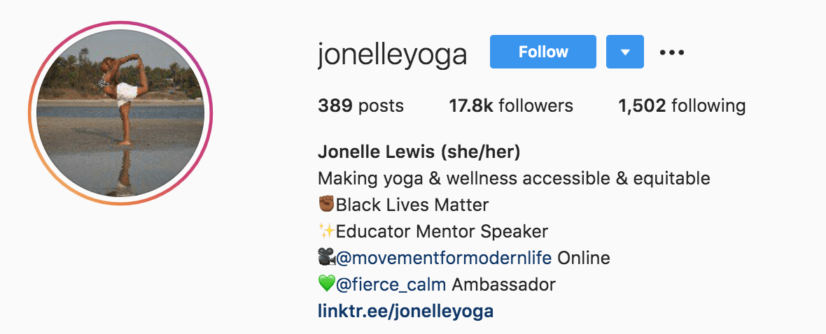 Jonelle Lewis uses her platform to make yoga and wellness inclusive and accessible. She speaks openly about racism and uses her voice to make a difference. Jonelle shares personal posts, yoga inspiration, and motivational words to empower her followers and change the industry.