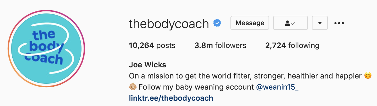 Joe now has 3.8 million followers on Instagram, sharing fitness tips and videos, and recipes. Wicks uses his influencer status to promote his 90-day fitness program, including workouts and recipes, to help followers achieve results. Joe regularly posts about the benefits of exercise and staying active as well as including user-generated before and after photos.